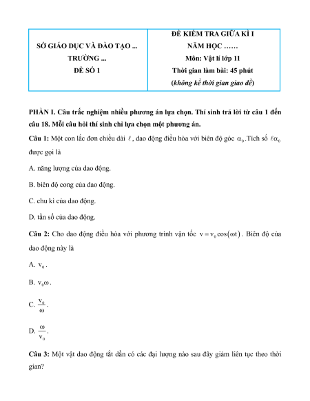 Môn: Vật lí lớp 11 ĐỀ SỐ 1
