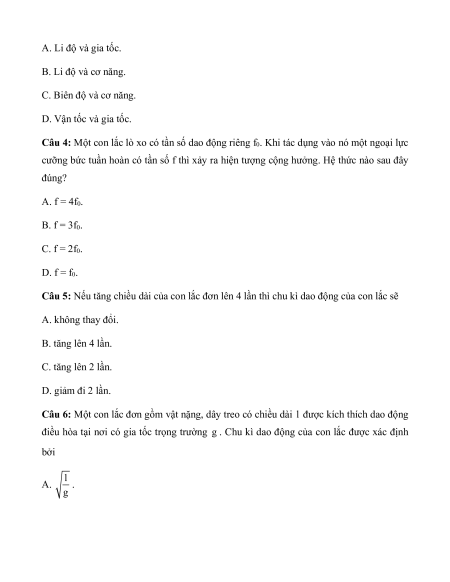 Câu 5: Nếu tăng chiều dài của con lắc đơn lên 4 lần thì chu kì dao động của con lắc sẽ A. không thay đổi. B. tăng lên 4 lần. C. tăng lên 2 lần. D. giảm đi 2 lần.