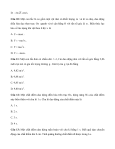 Câu 3: Một vật dao động tắt dần có các đại lượng nào sau đây giảm liên tục theo thời gian? A. Li độ và gia tốc. B. Li độ và cơ năng. C. Biên độ và cơ năng. D. Vận tốc và gia tốc.