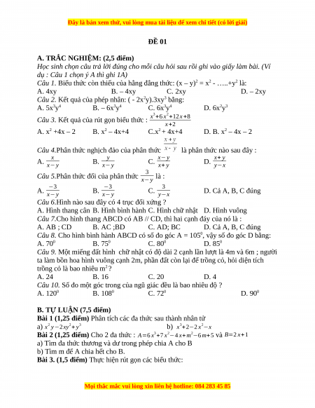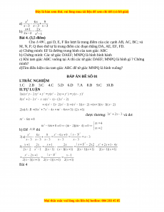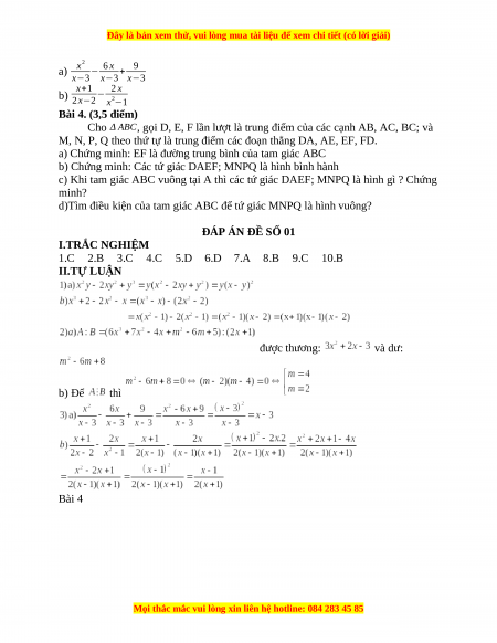 d)Tìm điều kiện của tam giác ABC để tứ giác MNPQ là hình vuông? ĐÁP ÁN ĐỀ SỐ 01 I.TRẮC NGHIỆM 1.C 2.B 3.C 4.C 5.D 6.D 7.A 8.B 9.C 10.B II.TỰ LUẬN được thương: và dư: b) Để thì Bài 4