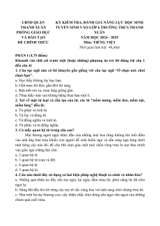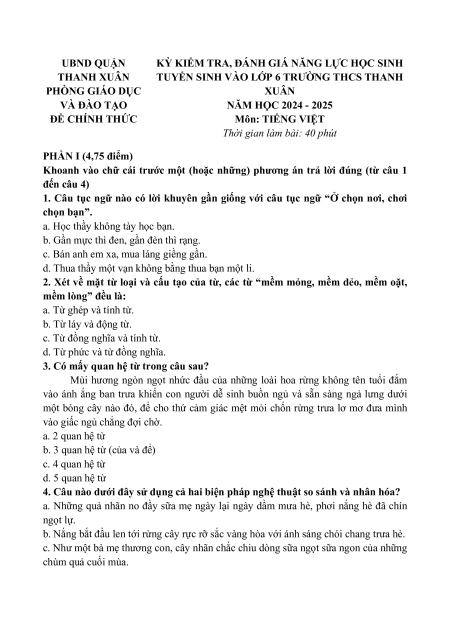 TUYỂN SINH VÀO LỚP 6 TRƯỜNG THCS THANH PHÒNG GIÁO DỤC XUÂN VÀ ĐÀO TẠO NĂM HỌC 2024 - 2025 ĐỀ CHÍNH THỨC Môn: TIẾNG VIỆT