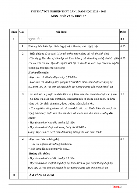 MÔN: NGỮ VĂN - KHỐI 12 Phần Câu Nội dung Điểm I ĐỌC HIỂU 3.0 1