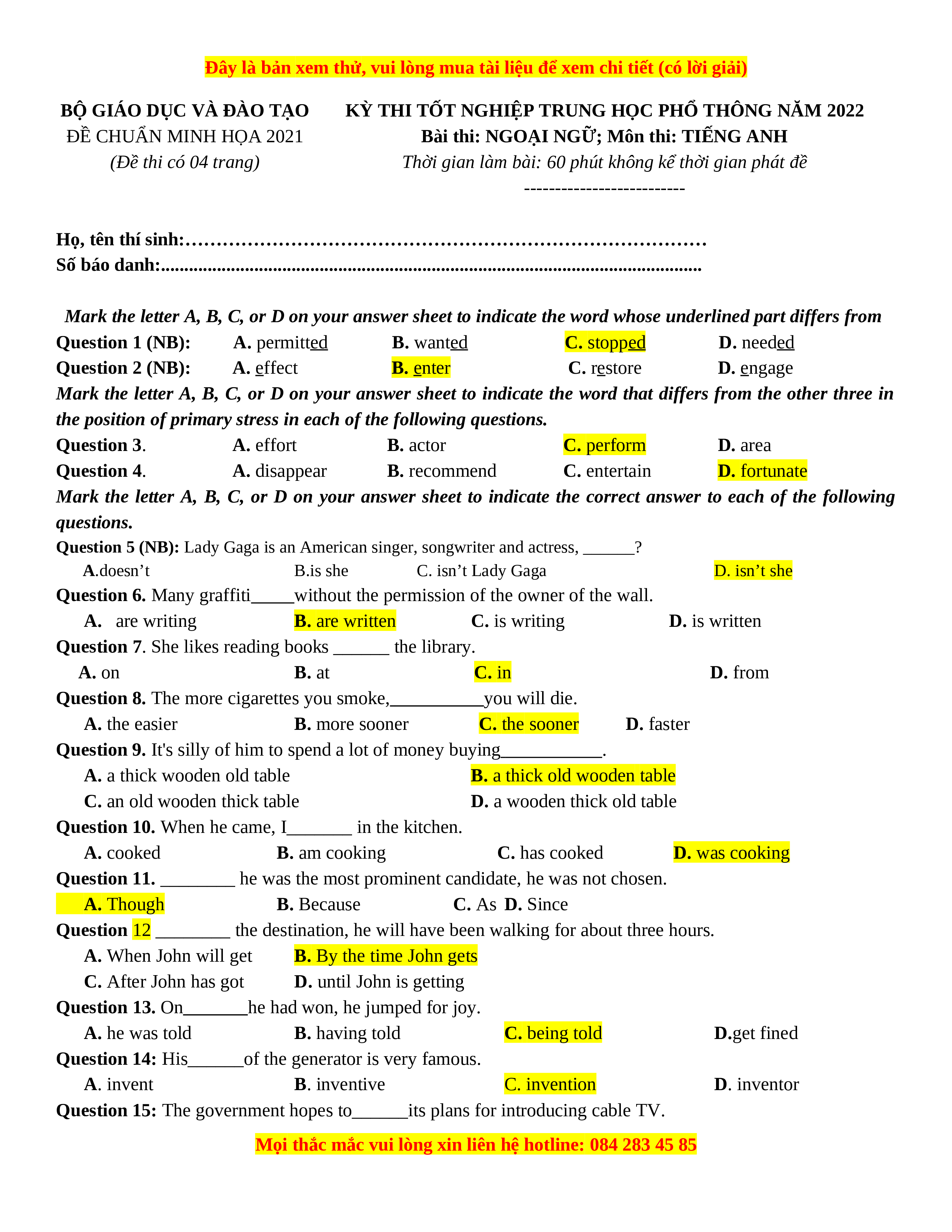 KỲ THI TỐT NGHIỆP TRUNG HỌC PHỔ THÔNG NĂM 2022 ĐỀ CHUẨN MINH HỌA 2021