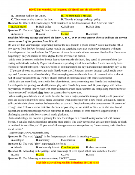 Question 34: Which of the following is NOT mentioned as the denomination of an American coin? A. Half nickel B. Half-dollar C. Hall cent D. Half dime
