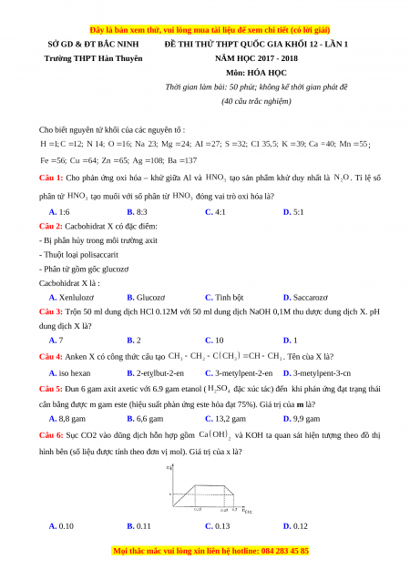 Trường THPT Hàn Thuyên NĂM HỌC 2017 - 2018 Môn: HÓA HỌC