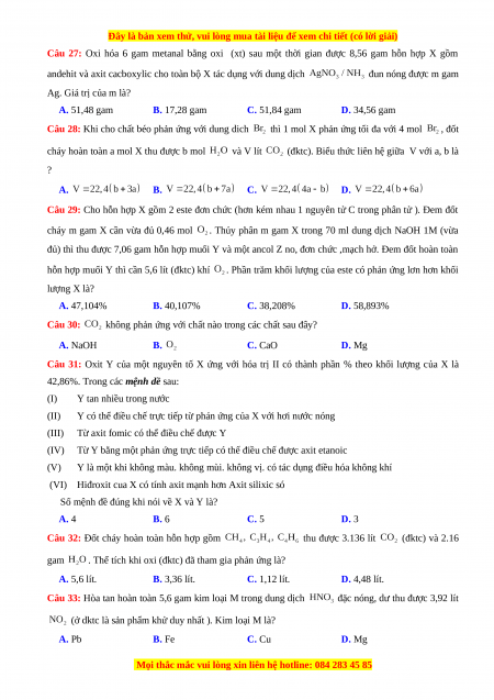 Câu 27: Oxi hóa 6 gam metanal bằng oxi (xt) sau một thời gian được 8,56 gam hỗn hợp X gồm