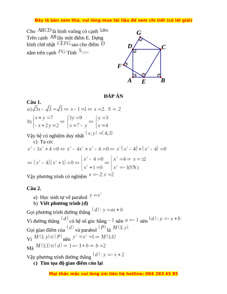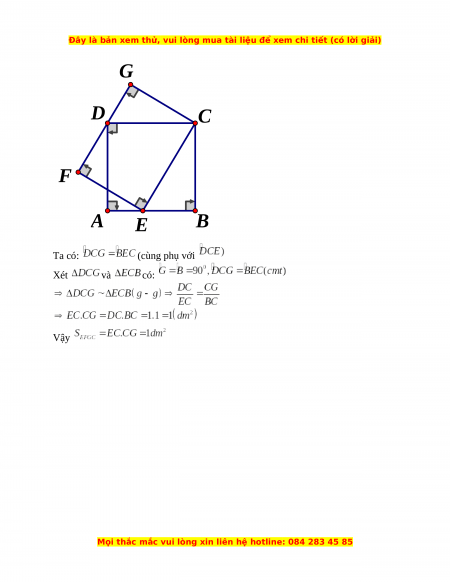 Cho là hình vuông có cạnh G Trên cạnh lấy một điểm E. Dựng hình chữ nhật sao cho điểm D C nằm trên cạnh Tính F A E B ĐÁP ÁN Câu 1.