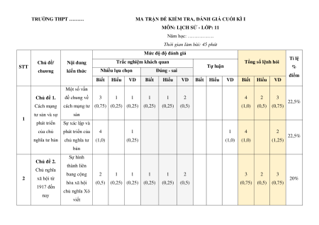 nghĩa tư bản chủ nghĩa tư (1,0) (0,25) (1,0) (1,0) (1,25) bản Sự hình Chủ đề 2. thành liên Chủ nghĩa bang cộng 2 1 1 1 1 2 3 2 3 2 xã hội từ 20% hòa xã hội (0,5) (0,25) (0,25) (0,25) (0,25) (0,5) (0,75) (0,5) (0,75) 1917 đến chủ nghĩa Xô nay viết Sự phát triển của chủ nghĩa xã hội từ sau 5 1 1 5 2 35% Chiến tranh (1,25) (0,25) (2,0) (1,25) (2,25) thế giới thứ hai đến nay