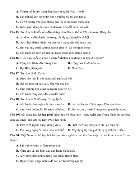 1.1. Trắc nghiệm nhiều phương án lựa chọn (5,0 điểm): Thí sinh trả lời từ câu 1 đến câu 20. Mỗi