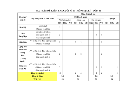 MA TRẬN ĐỀ KIỂM TRA CUỐI KÌ II - MÔN: ĐỊA LÍ – LỚP: 11 Mức độ đánh giá Chương/ TN khách quan