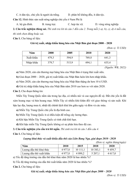 Câu 12. Hình thức sản xuất nông nghiêp chủ yêu ở Nam Phi la A. hô gia đình. B. trang trại. C. hợp tác xa. D. vùng nông nghiêp.