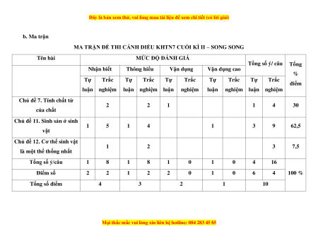 MA TRẬN ĐỀ THI CÁNH DIỀU KHTN7 CUỐI KÌ II – SONG SONG Tên bài