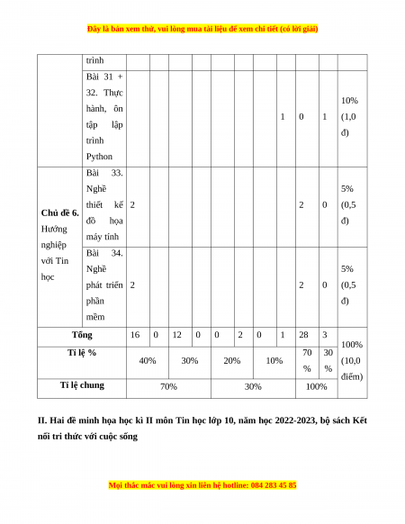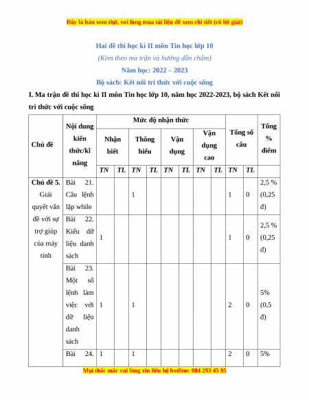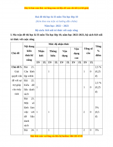 I. Ma trận đề thi học kì II môn Tin học lớp 10, năm học 2022-2023, bộ sách Kết nối