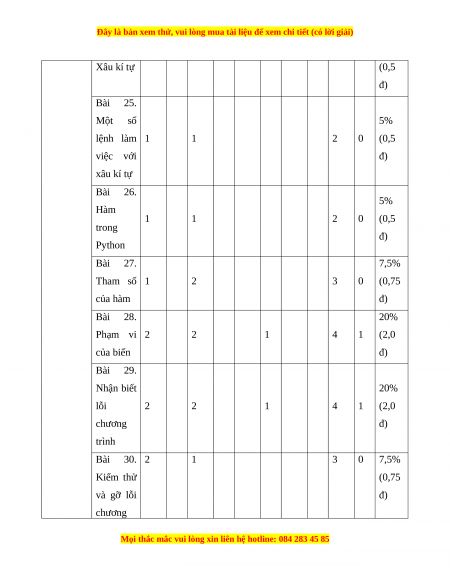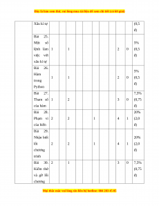 Xâu kí tự (0,5 đ) Bài 25. Một số 5% lệnh làm 1 1 2 0 (0,5 việc với đ) xâu kí tự Bài 26. 5% Hàm 1 1 2 0 (0,5 trong đ) Python Bài 27. 7,5% Tham số 1 2 3 0 (0,75 của hàm đ) Bài 28. 20% Phạm vi 2 2 1 4 1 (2,0 của biến đ) Bài 29. Nhận biết 20% lỗi 2 2 1 4 1 (2,0 chương đ) trình Bài 30. 2 1 3 0 7,5% Kiểm thử (0,75 và gỡ lỗi đ) chương