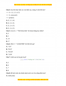 Câu 3. Toán tử nào dùng để kiểm tra một giá trị có nằm trong danh sách không? A. in. B. int. C. range. D. append.