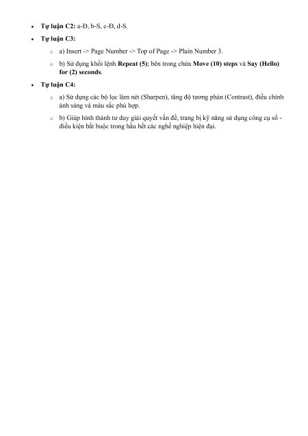 o b) Sử dụng khối lệnh Repeat (5); bên trong chứa Move (10) steps và Say (Hello) for (2) seconds. Tự luận C4: