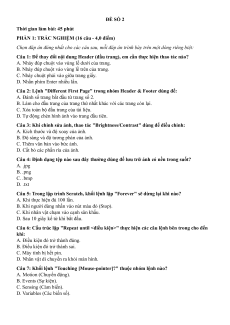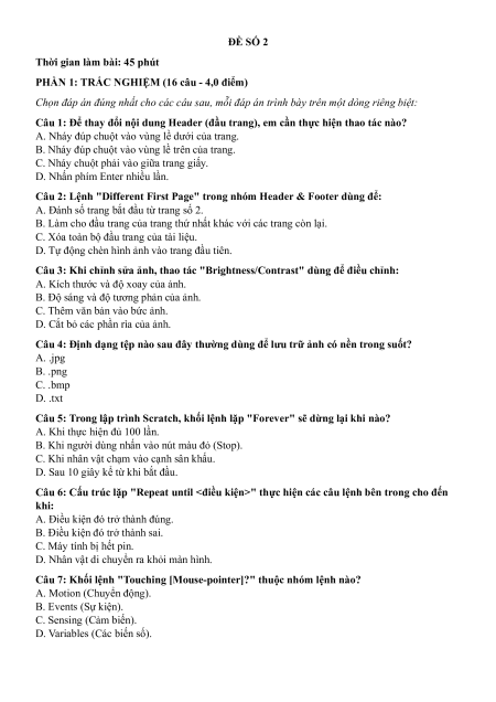 Câu 1: Để nội dung như "Tên tài liệu" hoặc "Số trang" xuất hiện ở mọi trang văn bản, em dùng chức năng: A. Page Break. B. Header và Footer. C. Table of Contents. D. Bullets and Numbering.
