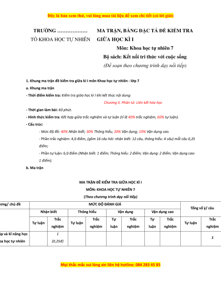 1. Khung ma trận đề kiểm tra giữa kì I môn Khoa học tự nhiên - lớp 7 a. Khung ma trận