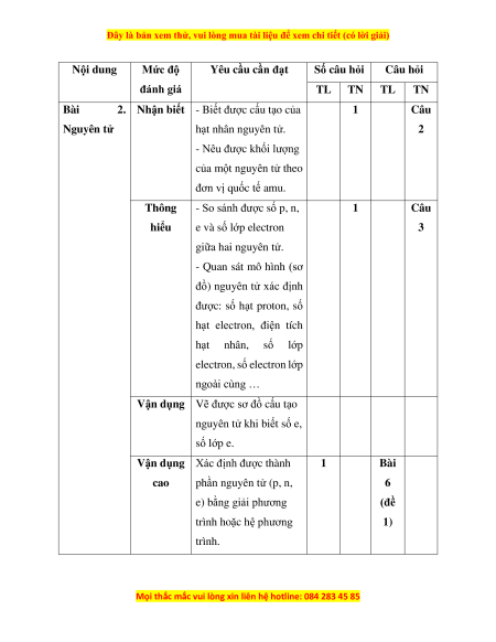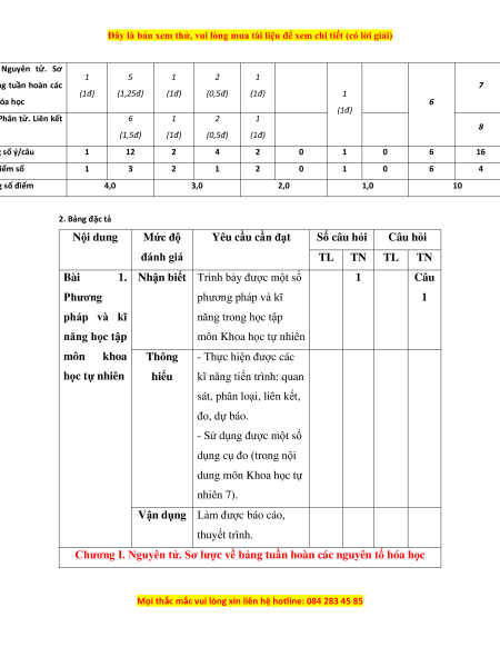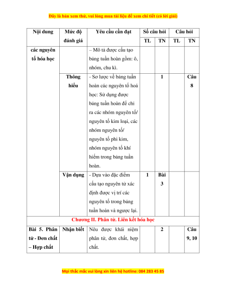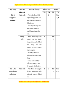 Chương II. Phân tử. Liên kết 6 1 2 1 8 hóa học (1,5đ) (1đ) (0,5đ) (1đ) Tổng số ý/câu 1 12 2 4 2 0 1 0 6 16 Điểm số 1 3 2 1 2 0 1 0 6 4 Tổng số điểm 4,0 3,0 2,0 1,0 10 2. Bảng đặc tả Nội dung Mức độ