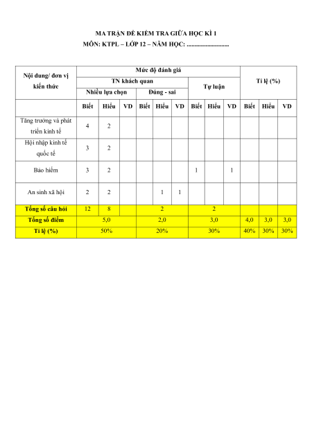 Hiểu VD Biết Hiểu VD Biết Hiểu VD Biết Hiểu VD Tăng trưởng và phát 4 2 triển kinh tế Hội nhập kinh tế 3 2 quốc tế Bảo hiểm 3 2 1 1 An sinh xã hội 2 2 1 1 Tổng số câu hỏi 12 8 2 2 Tổng số điểm 5,0 2,0 3,0 4,0 3,0 3,0 Tỉ lệ (%) 50% 20% 30% 40% 30% 30%