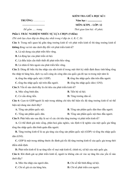 Câu 5: Phát biểu nào sau đây là sai về các chỉ tiêu tăng trưởng và phát triển kinh tế?