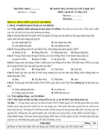 PHẦN A. PHÂN MÔN LỊCH SỬ (5,0 ĐIỂM)