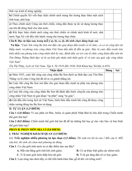 Câu 8: Đọc tư liệu sau, trong mỗi ý a), b), c), d), thí sinh chọn đúng hoặc sai.