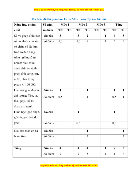 Ma trận đề thi giữa học kì I – Môn Toán lớp 4 – Kết nối Năng lực, phẩm Số câu, Mức 1 Mức 2 Mức 3 Tổng chất số điểm TN TL TN TL TN TL TN TL Số và phép tính: các Số câu 3 3 2 1 6 3 số có nhiều chữ số; Số điểm 1,5 1,5 2 1 3 3 số chẵn, số lẻ; làm tròn số đến hàng trăm nghìn; số tự nhiên; biểu thức chứa chữ, so sánh; phép tính cộng, trừ, nhân, chia trong phạm vi 100 000. Đại lượng và đo các Số câu 1 1 1 1 đại lượng: Yến, tạ, Số điểm 0,5 1 0,5 1 tấn, giây, thế kỉ, dm2; m2; mm2. Hình học: góc nhọn, Số câu 1 1 góc tù, góc bẹt, đo góc. Số điểm 0,5 0,5 Giải bài toán có ba Số câu 1 1 bước tính Số điểm 2 2 Tổng Số câu 4 4 4 1 8 5 Số điểm 2 2 5 1 4 6