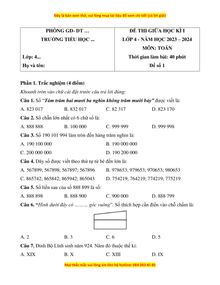 - Tailieugiaovien.com.vn giới thiệu bộ 7 đề giữa kì 1 gồm đầy đủ ma trận và lời giải chi tiết môn Toán lớp 4 Kết nối tri thức mới nhất nhằm giúp Giáo viên có thêm tài liệu tham khảo ra đề thi Toán lớp 4.