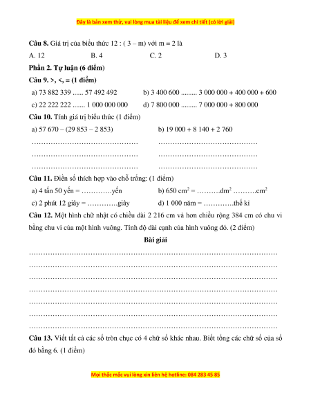 Câu 8. Giá trị của biểu thức 12 : ( 3 – m) với m = 2 là A. 12 B. 4 C. 2 D. 3
