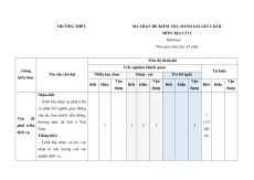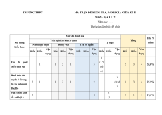 Trắc nghiệm khách quan Tổng Nội dung Tự luận điểm Nhiều lựa chọn Đúng - sai Trả lời ngắn kiến thức Vận Vận Vận Vận Vận Biết Hiểu Biết Hiểu Biết Hiểu Biết Hiểu Biết Hiểu dụng dụng dụng dụng dụng 1 Vấn đề phát (1,5 1 1 2 1 3 2 3 4 35,0% triển dịch vụ điể m) Khai thác thế 1 mạnh ở Trung 2 1 1 2 1 2 (0,5đ 3 3 4 27,5% du và miền núi ) Bắc Bộ Phát triển kinh 1 2 1 2 1 1 17,5% tế – xã hội ở (1 Đồng bằng điểm) sông Hồng Phát triển kinh tế - xã hội ở 4 2 2 4 2 2 20,0% Bắc Trung Bộ Tổng số câu/ 8 4 2 4 2 8 1 1 1 11 9 11 31 lệnh hỏi Tổng số điểm 3,0 2,0 2,0 3,0 4 3 3 10 Tỉ lệ % 30% 20% 20% 30% 40% 30% 30% 100% TRƯỜNG THPT