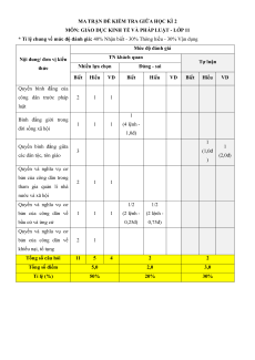 Nội dung/ đơn vị kiến TN khách quan Tự luận thức Nhiều lựa chọn Đúng - sai Biết Hiểu VD Biết Hiểu VD Biết Hiểu VD Quyền bình đẳng của công dân trước pháp 2 1 1 luật 1 Bình đẳng giới trong 1 1 1 (4 lệnh - đời sống xã hội 1,0đ) 1 Quyền bình đẳng giữa 1 3 (1,0đ các dân tộc, tôn giáo (2,0đ) ) Quyền và nghĩa vụ cơ bản của công dân trong 2 1 1 tham gia quản lí nhà nước và xã hội Quyền và nghĩa vụ cơ 1/2 1/2 bản của công dân về 1 1 1 (2 lệnh - (2 lệnh - bầu cử và ứng cử 0,25đ) 0,75đ) Quyền và nghĩa vụ cơ bản của công dân về 2 1 khiếu nại, tố tụng Tổng số câu hỏi 11 5 4 2 2 Tổng số điểm 5,0 2,0 3,0 Tỉ lệ (%) 50% 20% 30%