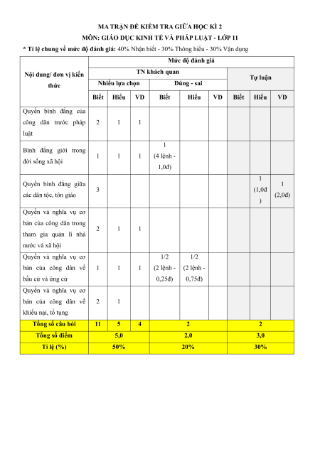 * Tỉ lệ chung về mức độ đánh giá: 40% Nhận biết - 30% Thông hiểu - 30% Vận dụng Mức độ đánh giá