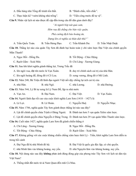 Câu 10. Thắng lợi nào của quân Tây Sơn đã đánh bại hoàn toàn ý chí xâm lược Đại Việt của chính quyền Mãn Thanh? A. Ngọc Hồi - Đống Đa.