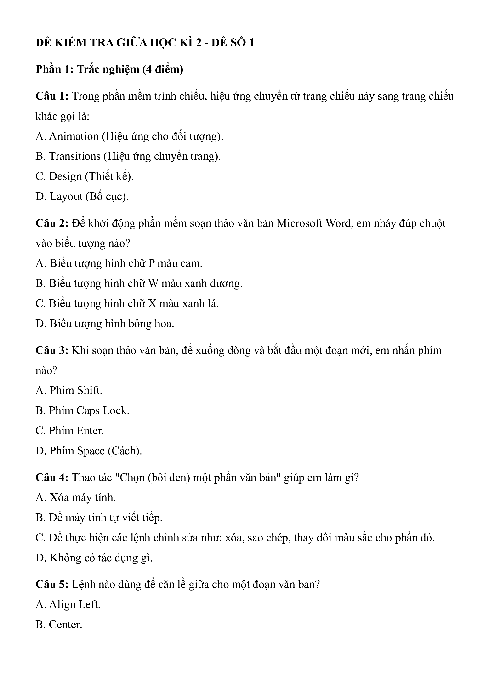 Câu 5: Lệnh nào dùng để căn lề giữa cho một đoạn văn bản? A. Align Left. B. Center. C. Align Right. D. Justify.