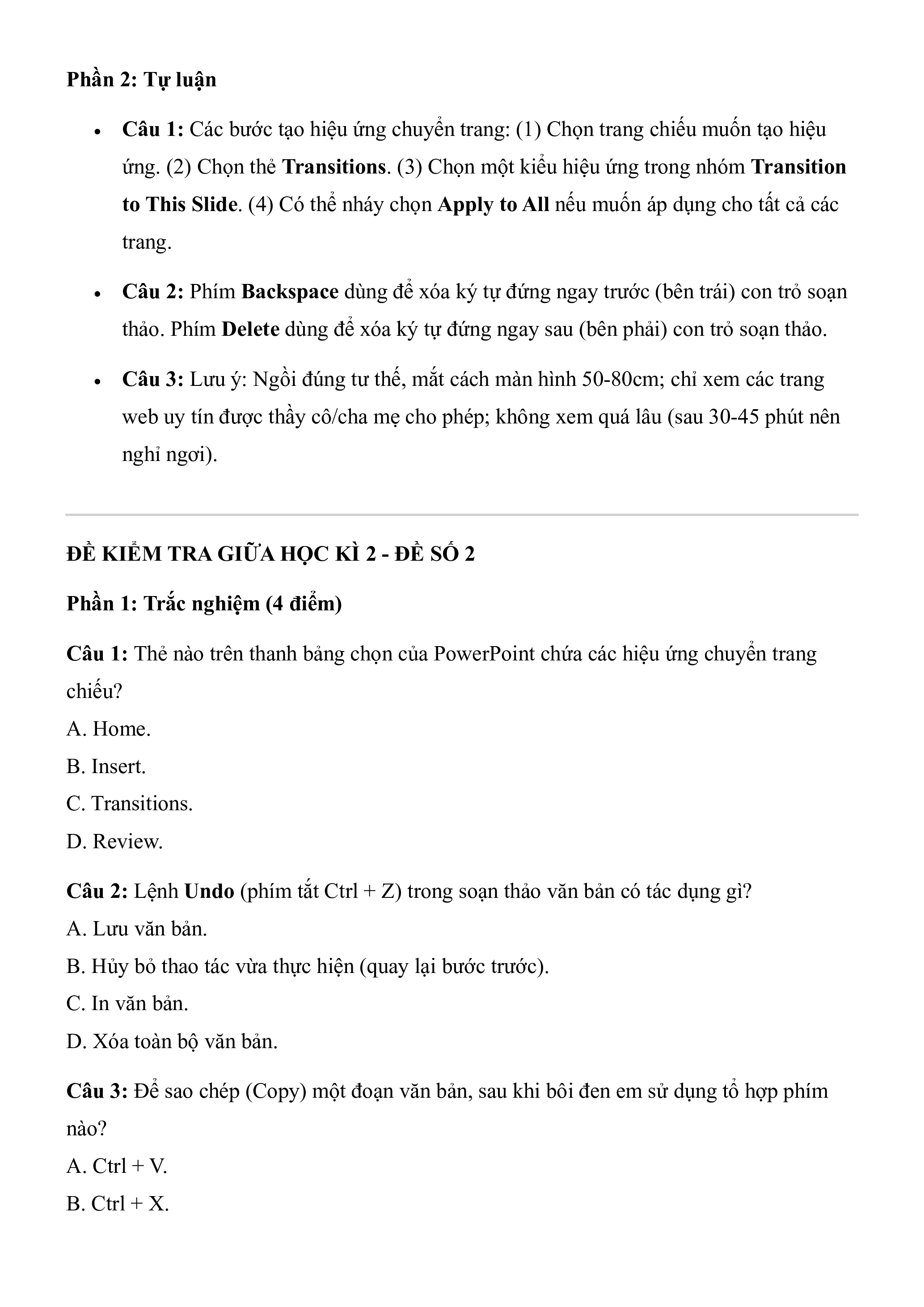 Câu 2: Lệnh Undo (phím tắt Ctrl + Z) trong soạn thảo văn bản có tác dụng gì? A. Lưu văn bản.