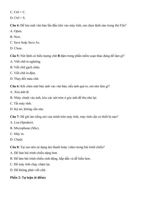 Câu 3: Để sao chép (Copy) một đoạn văn bản, sau khi bôi đen em sử dụng tổ hợp phím nào? A. Ctrl + V. B. Ctrl + X. C. Ctrl + C. D. Ctrl + S.
