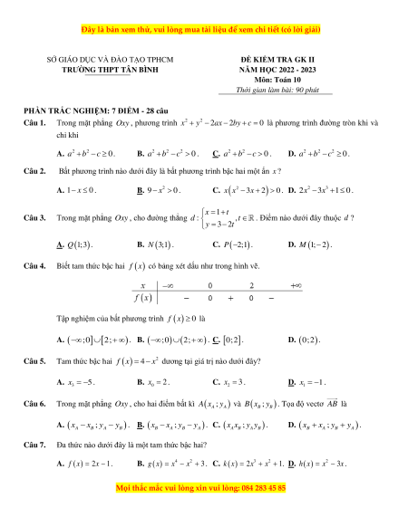 TRƯỜNG THPT TÂN BÌNH NĂM HỌC 2022 - 2023 Môn: Toán 10