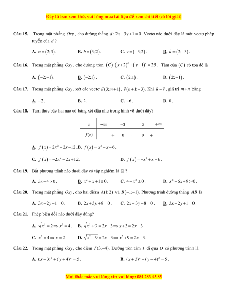 Câu 15. Trong mặt phẳng Oxy , cho đường thẳng d : 2x − 3y +1 = 0 . Vectơ nào dưới đây là một vectơ pháp