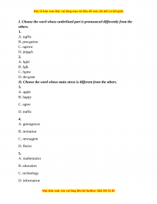 II. Choose the word whose main stress is different from the others. 3. A. apple B. happy C. agree D. traffic 4. A. greengrocer B. invitation C. newsagent D. florist 5. A. mathematics B. education C. technology D. information