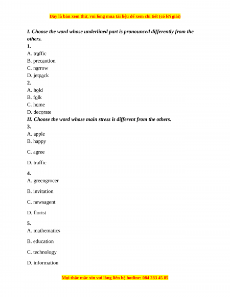 I. Choose the word whose underlined part is pronounced differently from the others. 1. A. traffic B. precaution C. narrow D. jetpack 2. A. hold B. folk C. home D. decorate