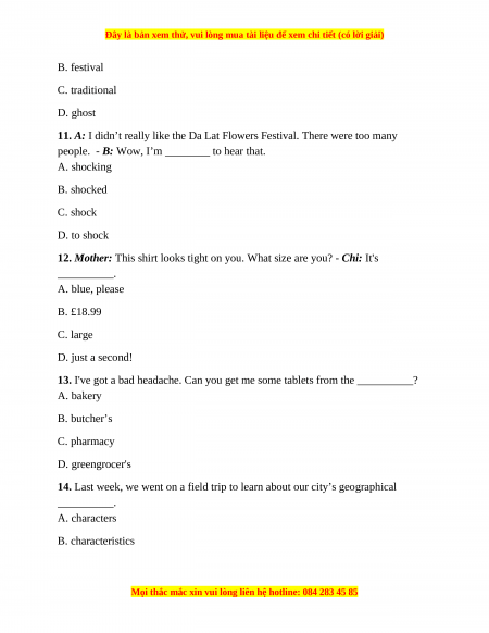 13. I've got a bad headache. Can you get me some tablets from the __________? A. bakery B. butcher’s C. pharmacy D. greengrocer's