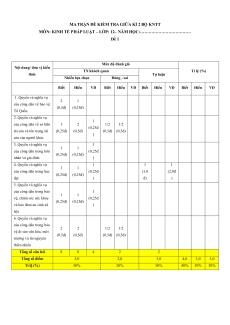 Nội dung/ đơn vị kiến TN khách quan Tỉ lệ (%) thức Tự luận Nhiều lựa chọn Đúng - sai Biết Hiểu VD Biết Hiểu VD Biết Hiểu VD Biết Hiểu VD 1. Quyền và nghĩa vụ 2 1