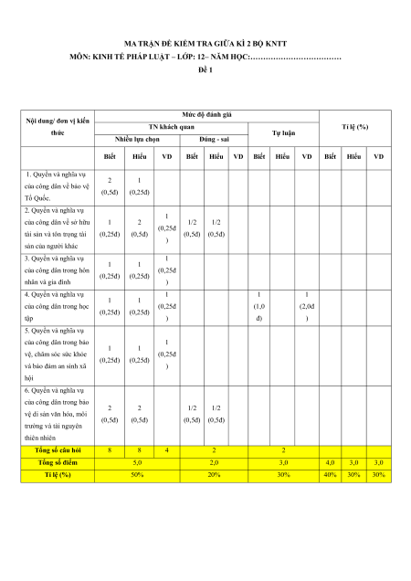 MÔN: KINH TẾ PHÁP LUẬT – LỚP: 12– NĂM HỌC:……………………………… Đề 1 Mức độ đánh giá