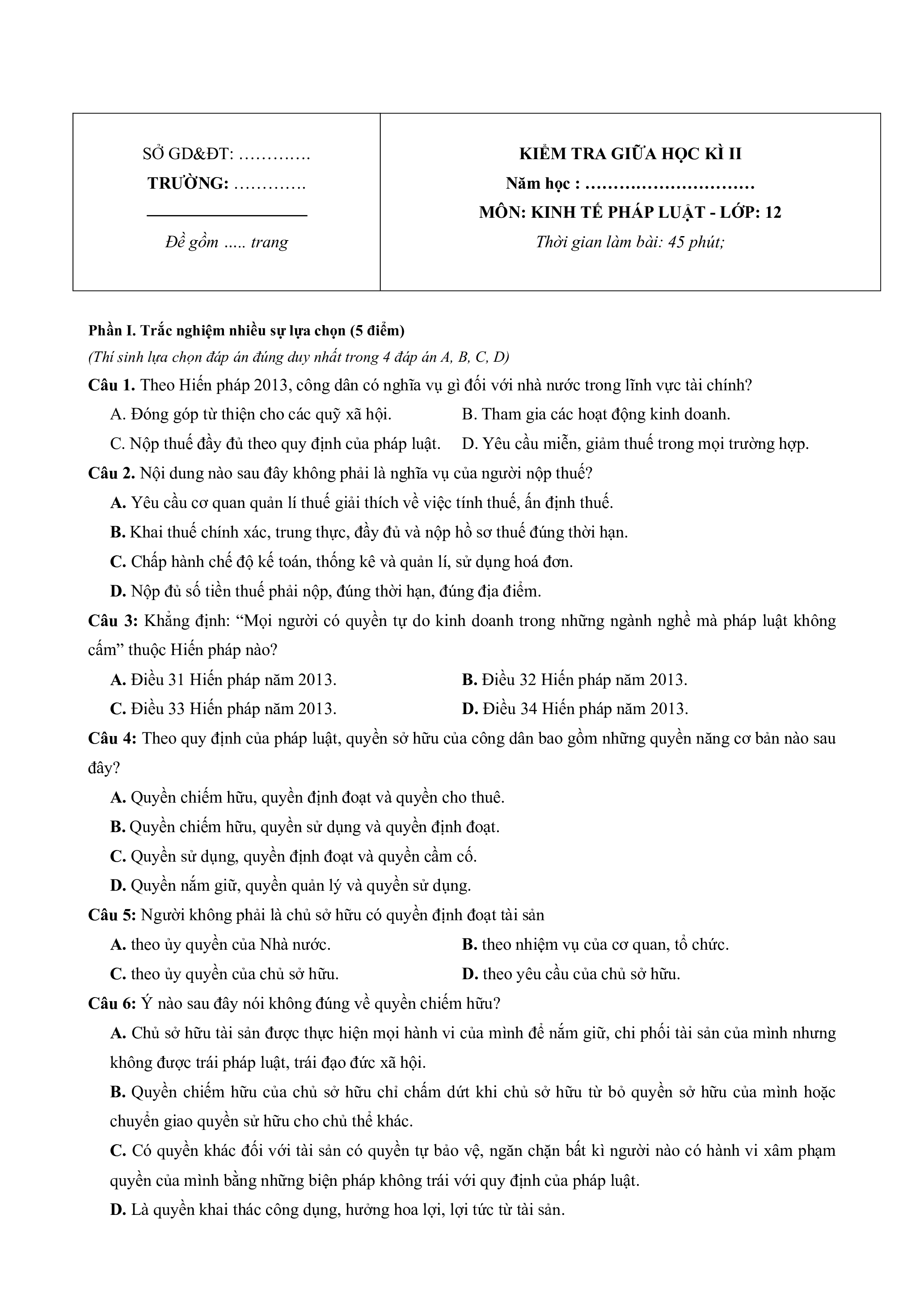 MÔN: KINH TẾ PHÁP LUẬT - LỚP: 12 Đề gồm …. trang