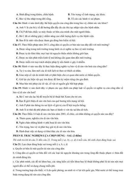 Câu 16: Hành vi nào dưới đây thể hiện quyền của công dân trong bảo vệ, chăm sóc sức khỏe?
