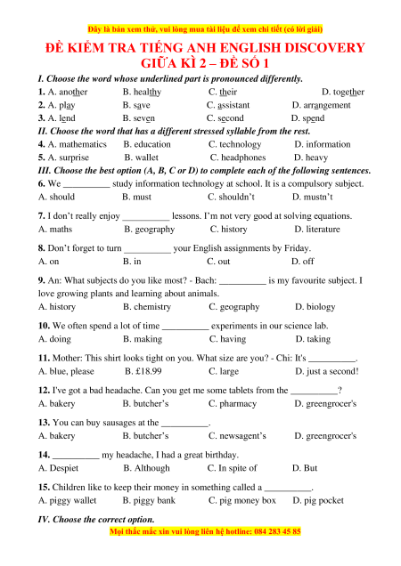 ĐỀ KIỂM TRA TIẾNG ANH ENGLISH DISCOVERY