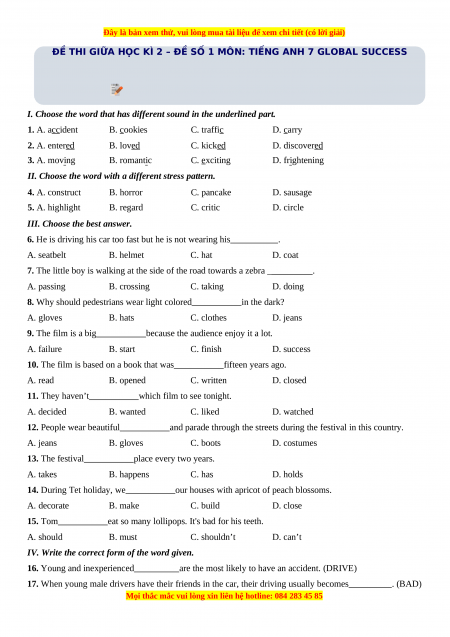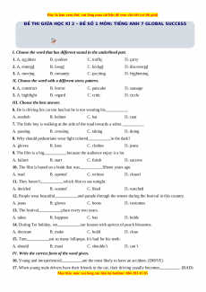 ĐỀ THI GIỮA HỌC KÌ 2 – ĐỀ SỐ 1 MÔN: TIẾNG ANH 7 GLOBAL SUCCESS