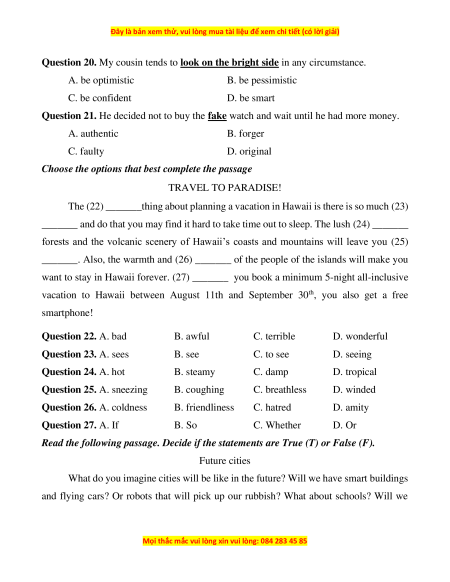 vacation to Hawaii between August 11th and September 30th, you also get a free smartphone! Question 22. A. bad B. awful C. terrible D. wonderful Question 23. A. sees B. see C. to see D. seeing Question 24. A. hot B. steamy C. damp D. tropical