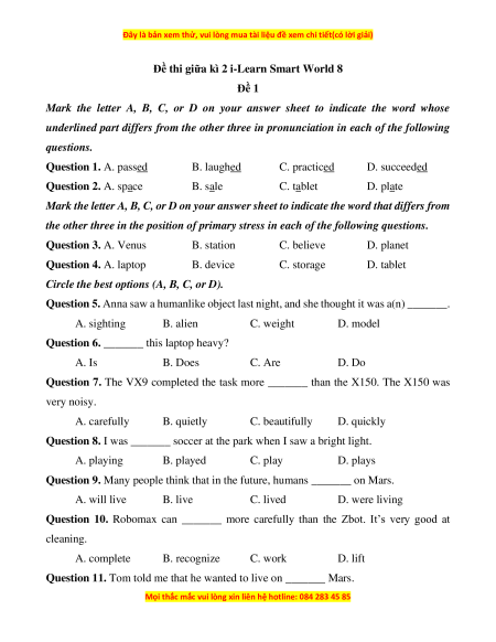 - Tailieugiaovien.com.vn giới thiệu bộ 8 đề thi giữa kì 2 Tiếng anh 8 ilearn smart world mới nhất nhằm giúp Giáo viên có thêm tài liệu tham khảo ra đề thi Tiếng anh lớp 8.